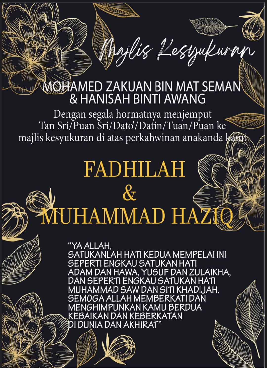 Jemputan majlis kesyukuran dan doa selamat kami sekeluarga ingin menjemput tuan/puan sekeluarga hadir ke majls kami yang akan diadakan seperti berikut .